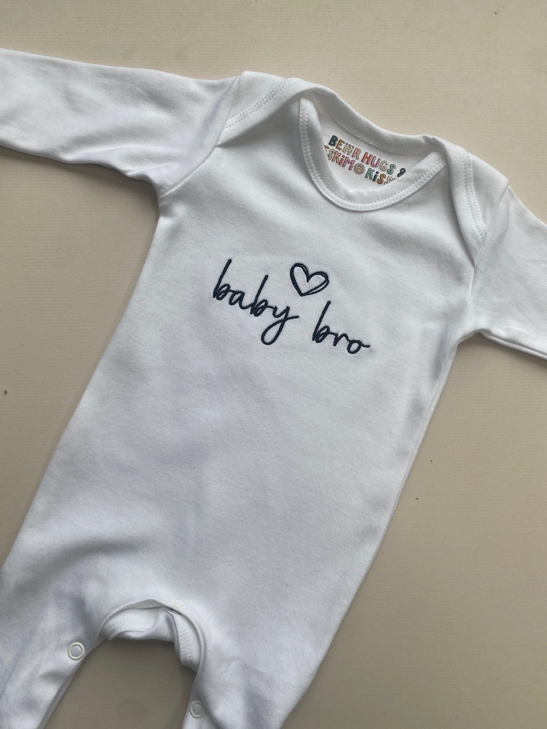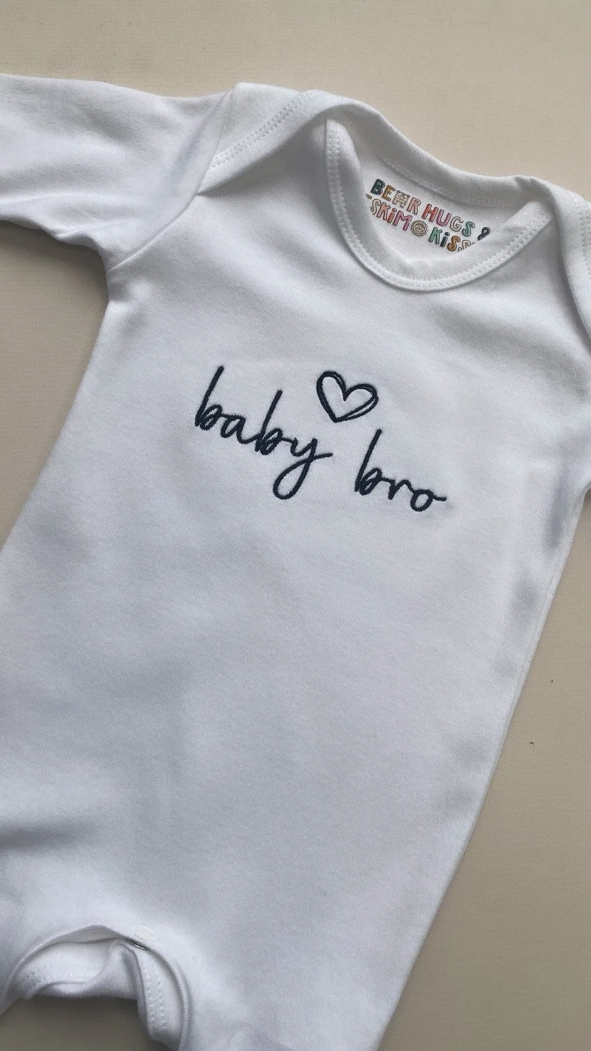 ‘baby bro’ or ‘baby sis’ is embroidered with the heart onto one of our super comfy, cotton babygrows in a number of thread colours.