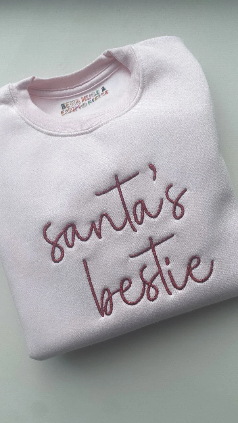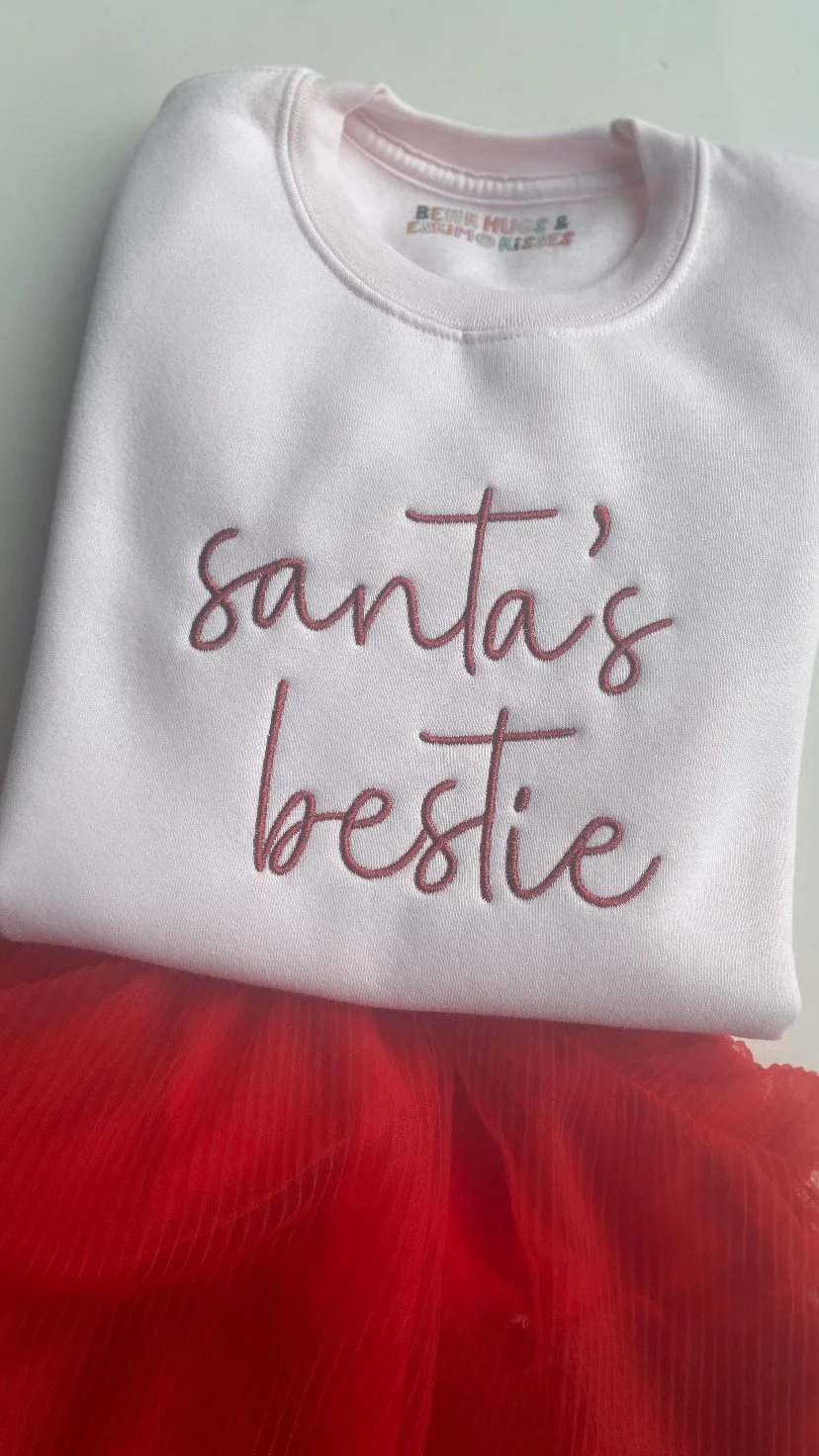 Are you Santa’s bestie? These tops are fully embroidered into our super soft, quality tops; using our autograph font. Available up to adult sizes.