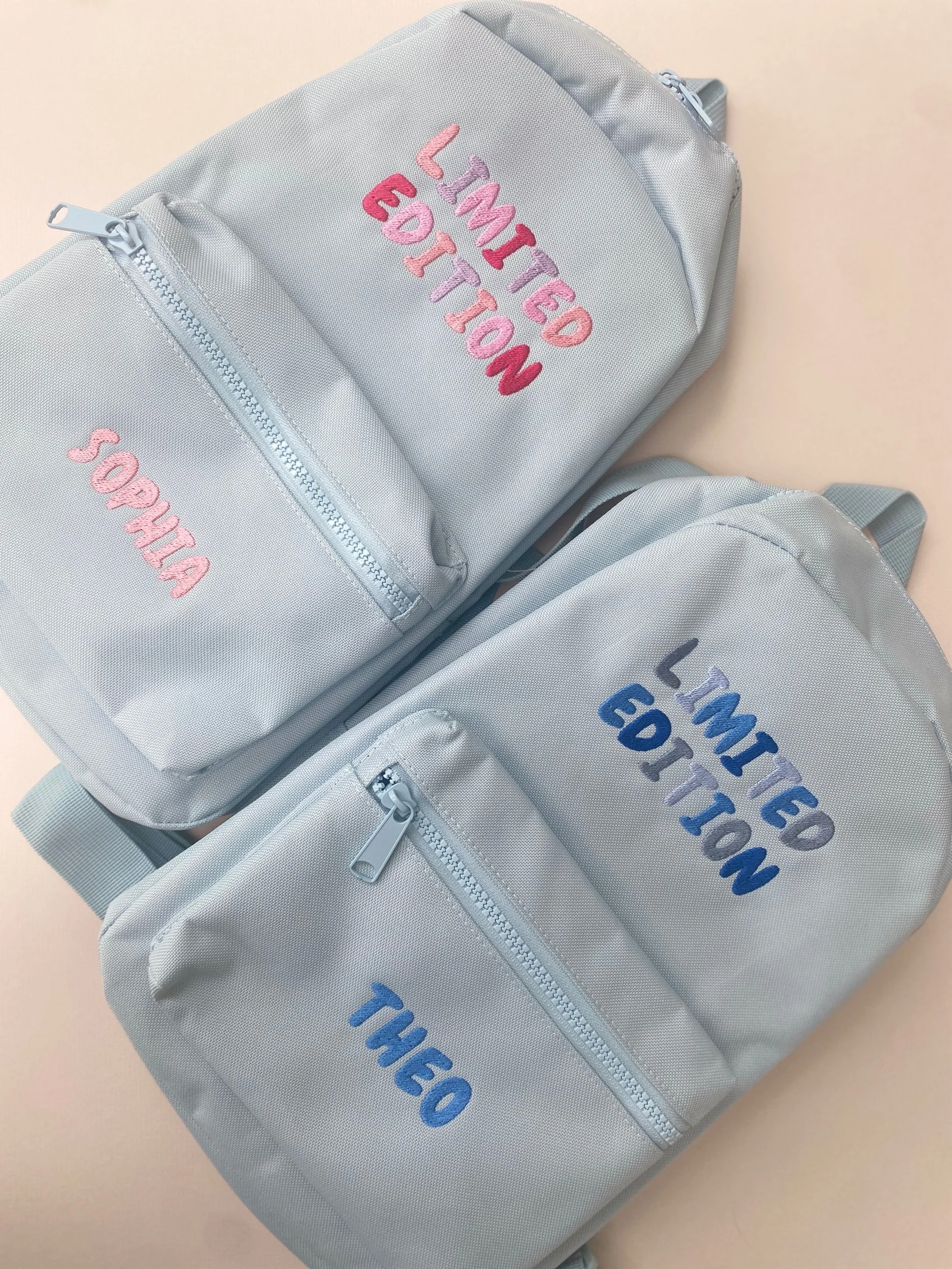 Introducing these gorgeous LIMITED EDITION backpacks. Embroidered in our bubble font, with the option to personalise on the pocket, with a name.